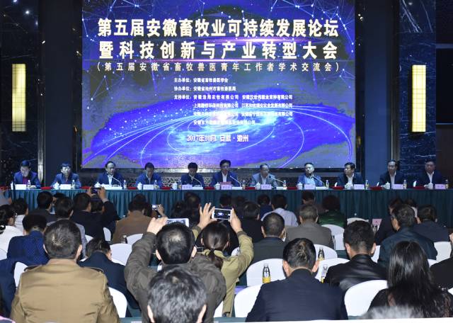2017年10月26日下午,在举国上下深入学习贯彻党的十九大精神,决胜全面建成小康社会,开启全面建设社会主义现代化国家新征程的日子里,以“生态、安全、创新和效益”为主题的第五届安徽省畜牧业可持续发展论坛暨科技创新与产业转型大会,在素有“千载诗人地”之誉的安徽池州隆重开幕了。这是安徽省畜牧兽医学界、业界的一个重要科技盛会!政府、专家、学会和畜牧企业代表等300余人聚首,共同探在当前畜牧业发展受到环保和土地等压力的“寒冬”情况下,如何让畜牧业实现可持续发展和转型升级等热门话题。论坛开幕式由董卫星理事长主持,随后安徽省池州市人民政府副市长夏吉苗在开幕式上介绍了池州及畜牧业的相关情况。中国畜牧兽医学会副秘书长李传业、安徽畜牧兽医局副局长田文钊分别发表了讲话。